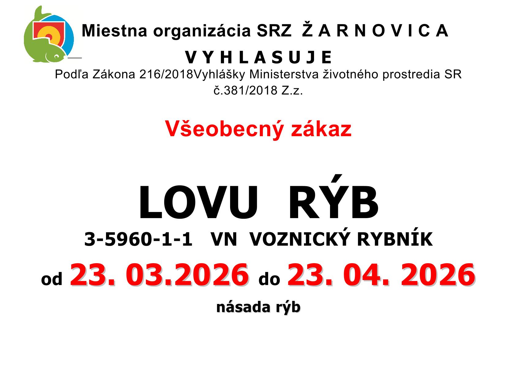 Všeobecný zákaz ZÁKAZ LOVU RÝB: VN VOZNICA, OD 23.3.2026 - DO 23.4.2026