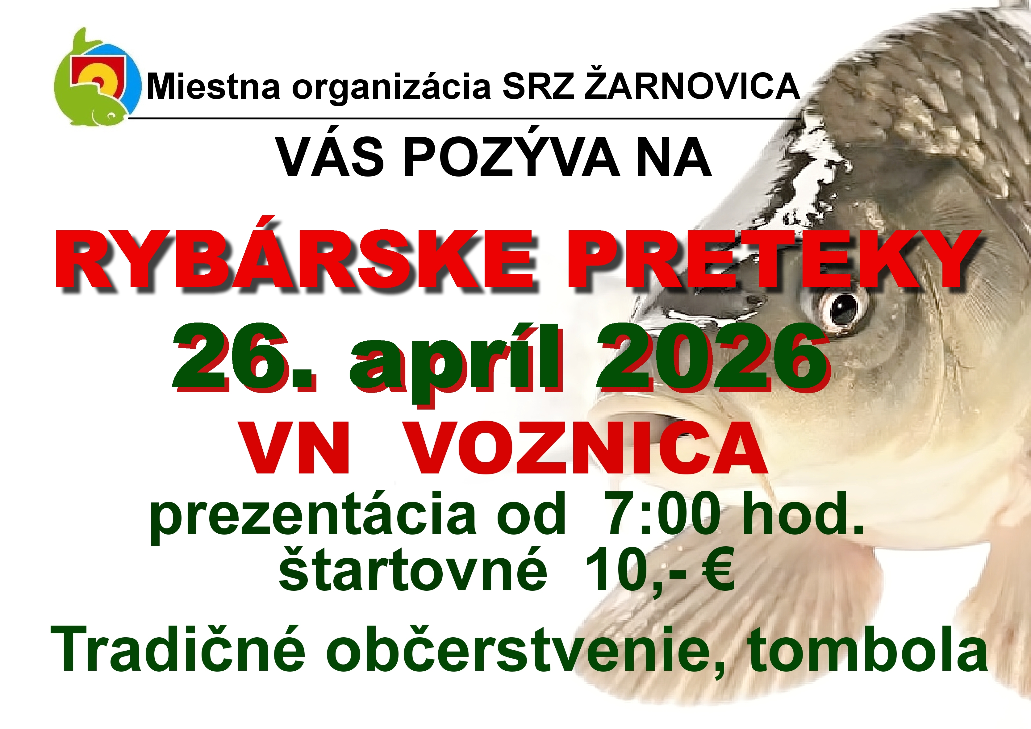 Slovenský rybársky zväz Žarnovica Rybárske revíry Novinky 3. apríl 2026 Rybárske preteky dospelých - VN VOZNICA 26.4.2026 o 7:00 hod Čítať viac 24. marec 2026 Všeobecný zákaz ZÁKAZ LOVU RÝB: VN VOZNICA, OD 23.3.2026 - DO 23.4.2026 Čítať viac 24. marec 2026 Jarná násada kapra K3 - 23.3.2026 Dňa 23.3.2026 bola zrealizovaná na našich revíroch násada kapra K3 v nasledovných množstvách:- VN... Čítať viac Žarnovica Weather Data Source: 30 days weather Zvolen Mesačná fáza Denný čas lovu rýb na kaprových vodách na Slovensku v roku 2026 Apríl od 6:00 do 21:00 Ďalšie informácie Slovenský rybársky zväz Informácie z oblasti rybárstva Mapa revírov Všetky Chovný pstruhový revír Kaprový revír Pstruhový revír Pílanský potok č.2Zobraziť revír Vyhniansky potokZobraziť revír TepláZobraziť revír Prochotský potokZobraziť revír Pílanský potok č.1Zobraziť revír Hron č. 5Zobraziť revír VN HodrušaZobraziť revír VN Muchov vŕšokZobraziť revír KľakZobraziť revír Hodrušský potokZobraziť revír VN KopaniceZobraziť revír VN Pustý hradZobraziť revír VN VoznicaZobraziť revír Športová činnosť Športová činnosť SRZ MO ŽarnovicaSRZ MO Žarnovica sa aktívne podieľa na organizovaní a podpore... Zobraziť činnosť Galéria Jarné zarybnenie 2025 Galéria 2025_05 Rybárske preteky 2025 - VN Voznica Galéria 2025_04 Násada Pstruha dúhového Galéria 2025_11 Násada Lieň, Šťuka 20.11.2025- VN Voznica, VN Kopanice, VN Pustý Hrad Galéria 2017_05 Preteky detí MDD Voznica Galéria 2025_04 Násada Pstruha potočného - 15.4.2025 Galéria 2024_06 Rybárske preteky MDD Galéria 2024_08 LOV A PEČENIE PSTRUHA DÚHOVÉHO Galéria 2024_12 Násada Kapra K3 - VN HODRUŠA Galéria 2025_05 MDD - rybárske preteky detí 2025 - VN VOZNICA Galéria 2024_11 Jesenné zarybnenie vôd MO SRZ Žarnovica násadou kapra - K3 Galéria 2024_05 Rybárske preteky dospelých Galéria VN Voznica, násada K2 - 700kg, 23.10.2025 Galéria 2018_05 Lov Pstruha dúhového Galéria 2025_04 brigádnická činnosť