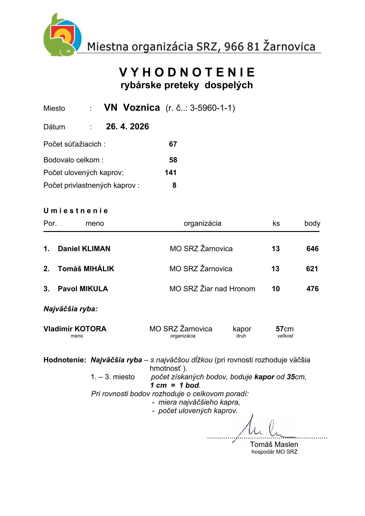 Slovenský rybársky zväz Žarnovica Rybárske revíry Novinky 24. apríl 2026 Násada rýb - šťuka "rýchlená" 23.4.2026 Dňa 23.4.2026 sa uskutočnila násada šťuky"rýchlenej":- Hron - 4 500 ks- VN Muchov Vŕšok - 500 ks Čítať viac 22. apríl 2026 Brigáda pri poriadaní rybárskych pretekov 25-26.4.2026 Brigáda pri poriadaní rybárskych pretekov VN VoznicaČlenovia , ktorí máte záujem odpracovať si... Čítať viac 15. apríl 2026 Všeobecný ZÁKAZ LOVU RÝB: VN VOZNICA, OD 24.4.2026 - DO 26.4.2026 - rybárske preteky Čítať viac Žarnovica Weather Data Source: 30 days weather Zvolen Mesačná fáza Denný čas lovu rýb na kaprových vodách na Slovensku v roku 2026 Apríl od 6:00 do 21:00 Ďalšie informácie Slovenský rybársky zväz Informácie z oblasti rybárstva Mapa revírov Všetky Chovný pstruhový revír Kaprový revír Pstruhový revír Pílanský potok č.2Zobraziť revír Vyhniansky potokZobraziť revír TepláZobraziť revír Prochotský potokZobraziť revír Pílanský potok č.1Zobraziť revír Hron č. 5Zobraziť revír VN HodrušaZobraziť revír VN Muchov vŕšokZobraziť revír KľakZobraziť revír Hodrušský potokZobraziť revír VN KopaniceZobraziť revír VN Pustý hradZobraziť revír VN VoznicaZobraziť revír Športová činnosť Športová činnosť SRZ MO ŽarnovicaSRZ MO Žarnovica sa aktívne podieľa na organizovaní a podpore... Zobraziť činnosť Galéria 2025_05 MDD - rybárske preteky detí 2025 - VN VOZNICA Galéria Jarné zarybnenie 2025 Galéria 2017_05 Preteky detí MDD Voznica Galéria 2018_05 Lov Pstruha dúhového Galéria 2025_11 Zarybnenie VN Hodruša + VN Kopanice Galéria 2024_11 Jesenné zarybnenie vôd MO SRZ Žarnovica násadou kapra - K3 Galéria 2025_11 Násada Lieň, Šťuka 20.11.2025- VN Voznica, VN Kopanice, VN Pustý Hrad Galéria 2025_04 Násada Pstruha potočného - 15.4.2025 Galéria 2025_04 brigádnická činnosť Galéria 2024_12 Násada Kapra K3 - VN HODRUŠA Galéria 2025_04 Násada Pstruha dúhového Galéria Násada rýb - Kľak - pstruh dúhový - 8.4.2026 Galéria VN Voznica, násada K2 - 700kg, 23.10.2025 Galéria 2024_08 LOV A PEČENIE PSTRUHA DÚHOVÉHO Galéria 2024_05 Rybárske preteky dospelých