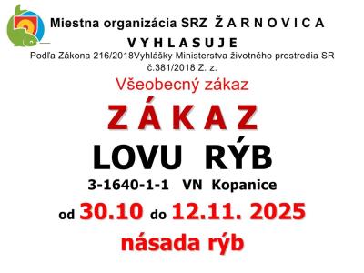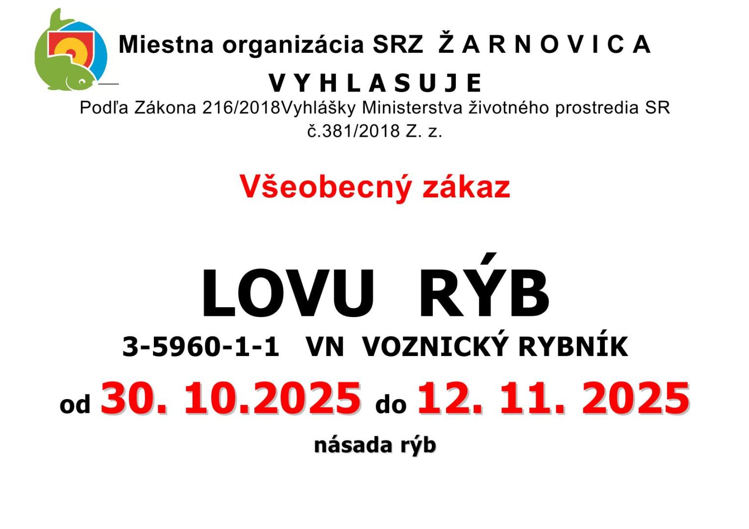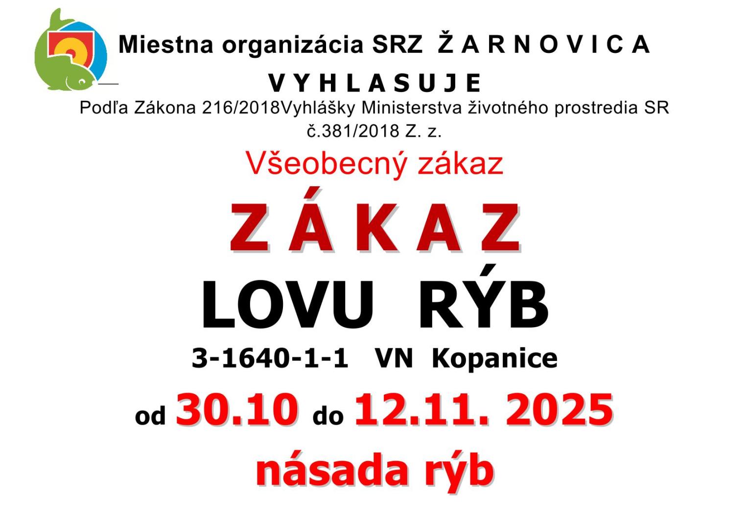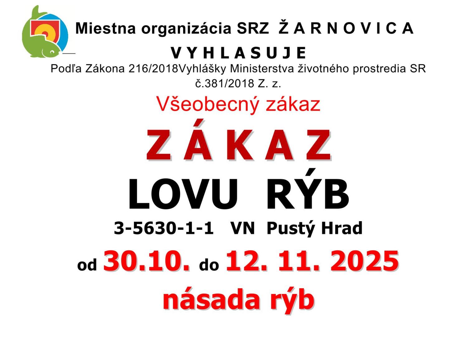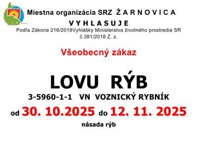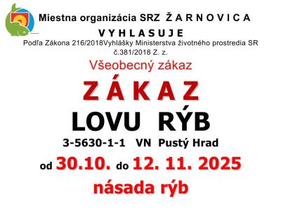 Všeobecný zákaz ZÁKAZ LOVU RÝB: VN PUSTÝ HRAD, VN VOZNICA, VN KOPANICE OD 30.10.2025 - DO 12.11.2025
